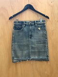dark blue grey stonewash denim skirt. Stretch denim for super fit with raw detail. Summer staple and stylet that never dates. Sits just mid thigh.
