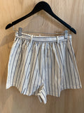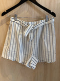 Creme and Navy Blue striped linen shorts. Featuring a belt to flatter the waist, the perfect summer shorts!