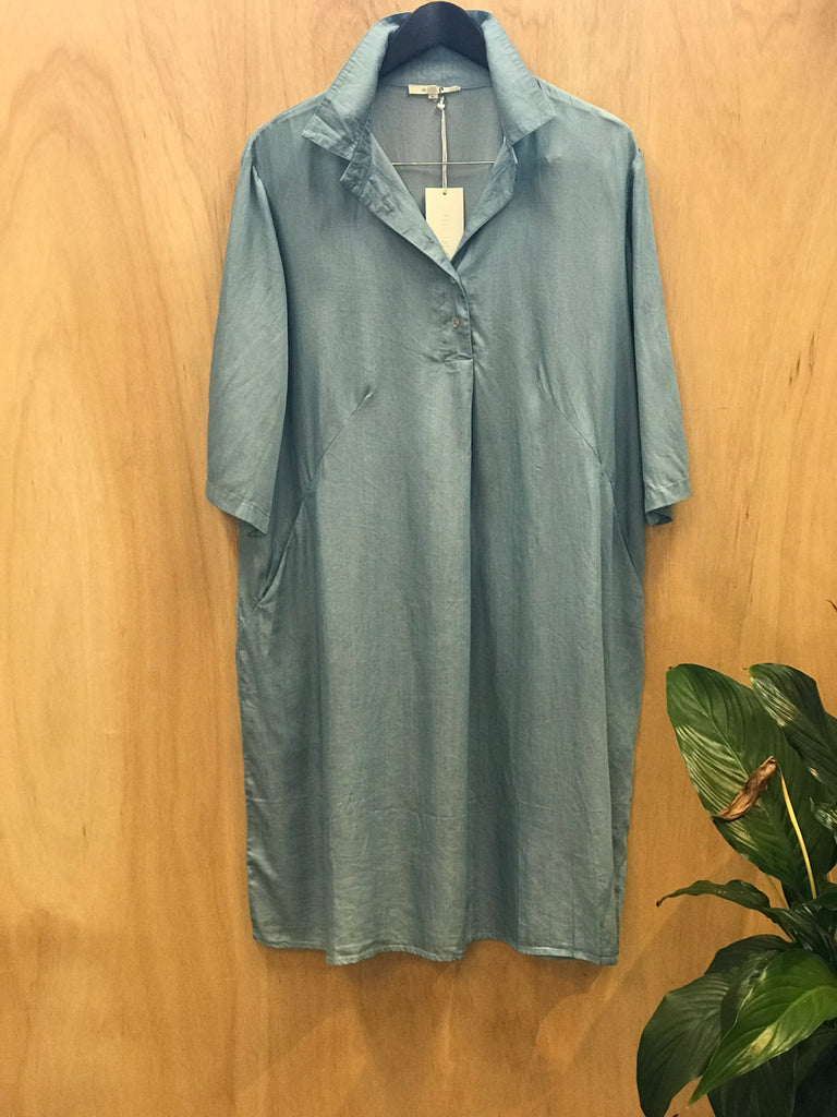 Loose fitting, soft, very light and breezy blue cotton dress with collar and pockets.