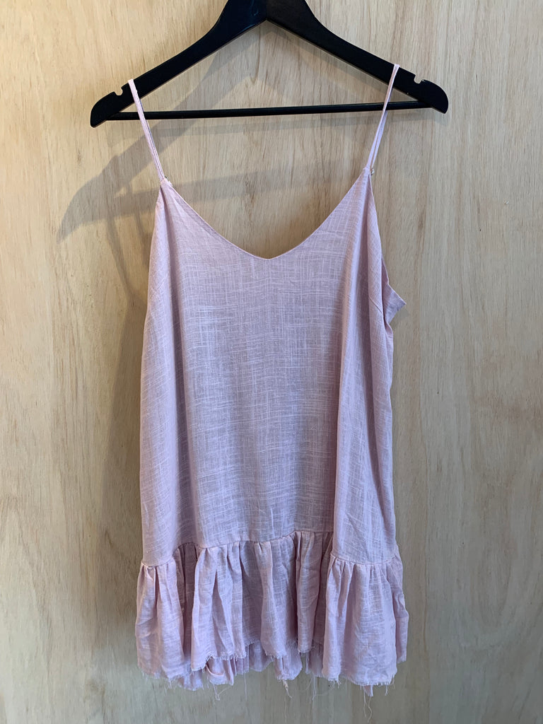 This dress is a gorgeous pastel pink colour that is also double lined and has a frilled detailing at the bottom of the dress.
